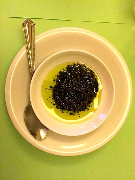 非常好吃單吃就很爽口的羅勒醬,其實它是等等要用來沾麵包一起吃的