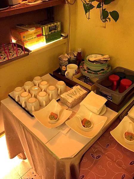 旁邊的小桌有自行取用的杯子和紙巾