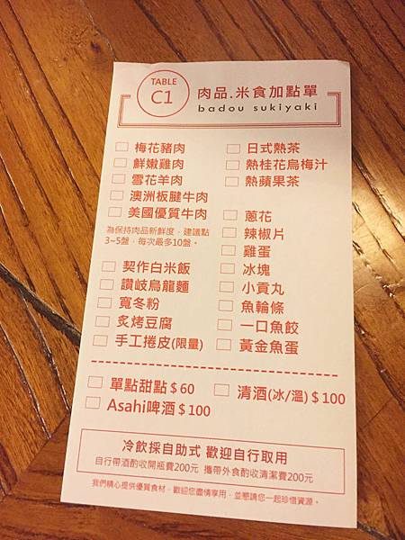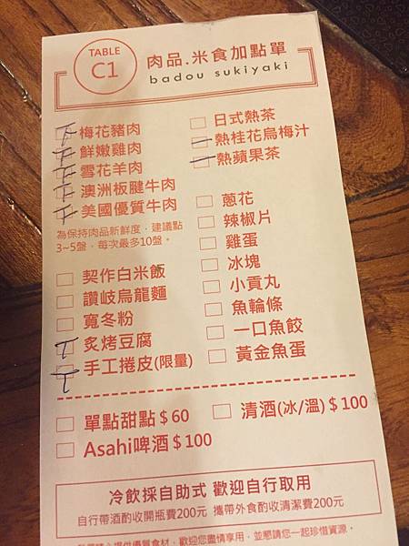 這張是肉品以及米食的加點單,想吃什麼就從這裡劃記再交給服務人員即可